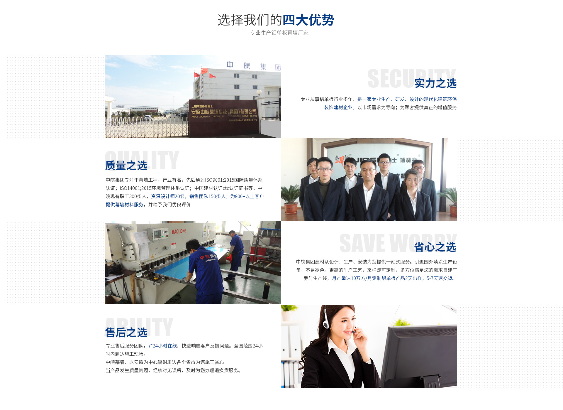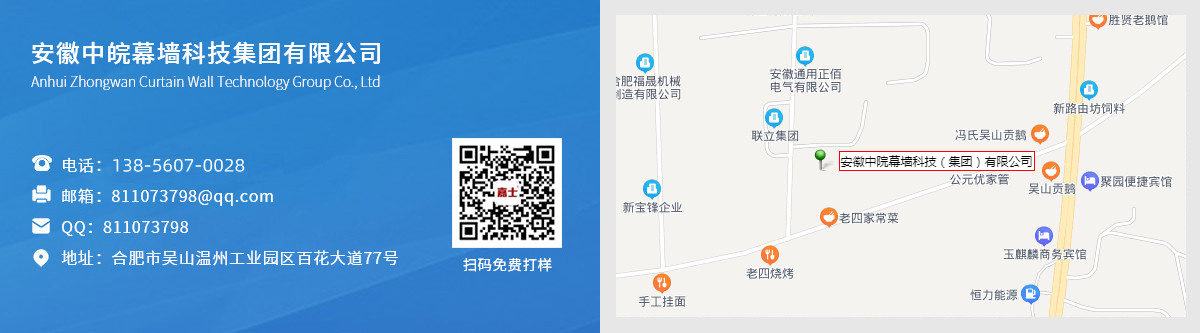 安徽中皖幕墻科技(集團(tuán))有限公司 安徽中皖集團(tuán)是一家幕墻鋁單板生產(chǎn)、研發(fā)、設(shè)計(jì)、銷售一體化的現(xiàn)代化建筑環(huán)保裝飾建材企業(yè)。 旗下控股公司: 安徽嘉士新型材料有限公司 安徽博利泰幕墻有限公司 安徽泰鋁裝飾建材有限公司 中皖旗下品牌通過ISO9001;2015國際質(zhì)量體系認(rèn)證和ISO14001;2015環(huán)境管理體系認(rèn)證,中國建材認(rèn)證ctc認(rèn)證的專業(yè)認(rèn)證書。并榮獲重合同守信用企業(yè);認(rèn)證證書;重質(zhì)量守信用企...